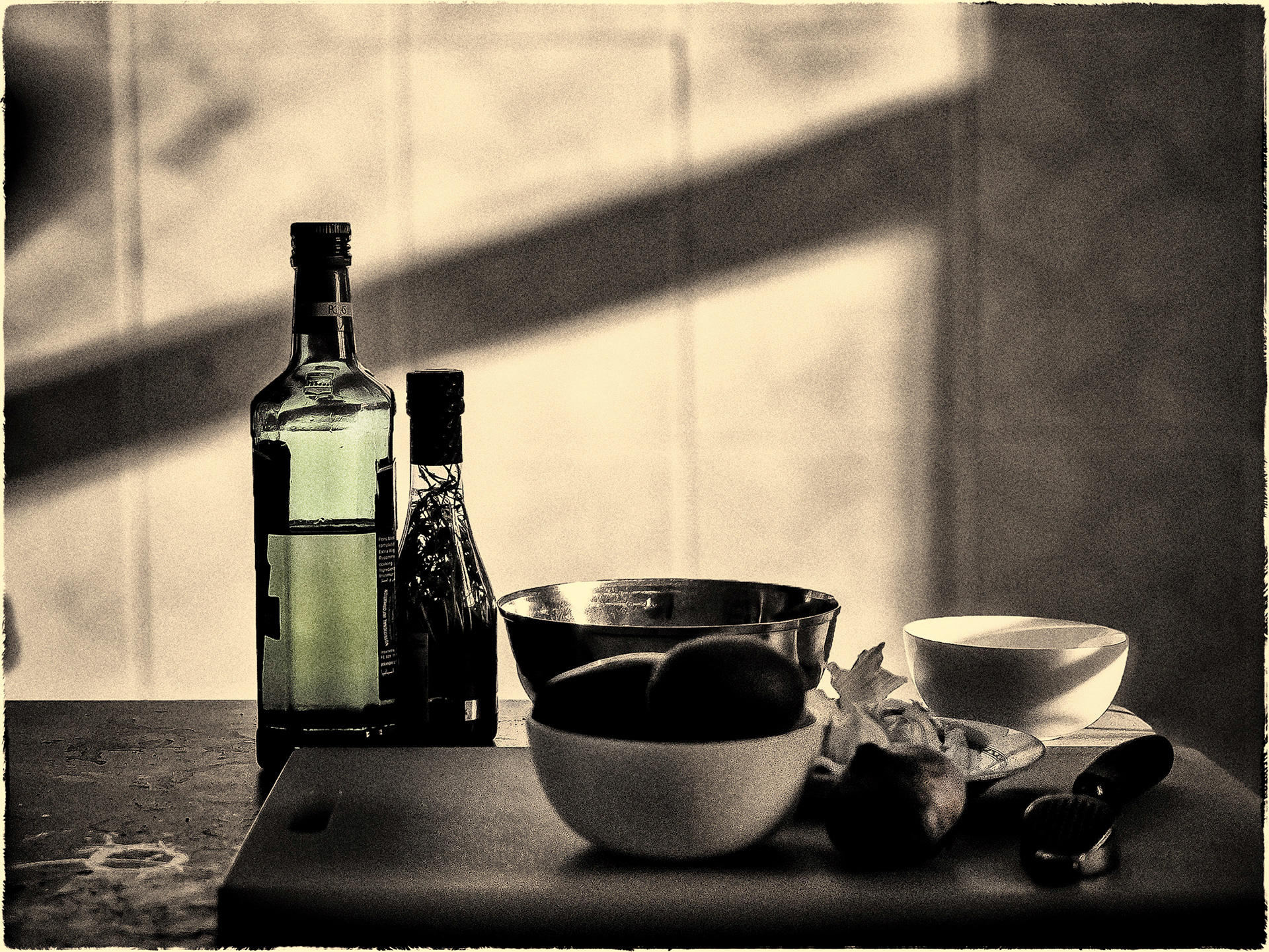 The photographs in this collection were inspired by the kitchen still lifes of Jan Groover. All the pictures were taken using available light. I took them during the winter months of 2012 – 13 and in November and December of 2013 mostly between 7:30 and 9:00 in the morning. This was because at that time of year and day, the light was coming through the window at exactly the right angle. The camera used for this project was a Panasonic Lumix G3. The lenses were the Lumix G 20mm and the Lumix G X Vario 35 – 100 f2.8.